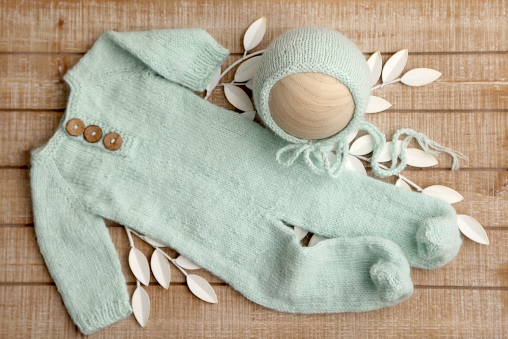 Beautiful newborn footed romper and bonnet set. Knit from super soft and fuzzy yarn. Perfect newborn photo prop or take-me-home outfit for babies under 14 days.