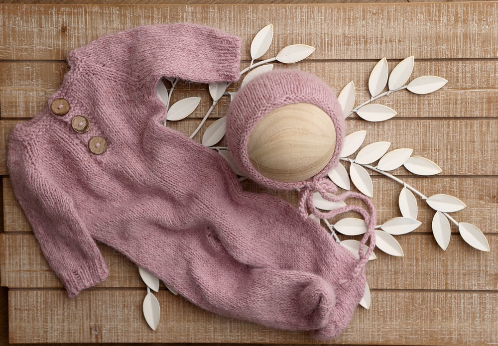 Beautiful newborn footed romper and bonnet set. Knit from super soft and fuzzy yarn. Perfect newborn photo prop or take-me-home outfit for babies under 14 days.