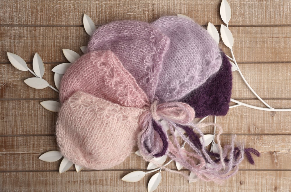 Soft and sweet newborn bonnet, lovingly hand knit from high quality mohair blend yarn.
