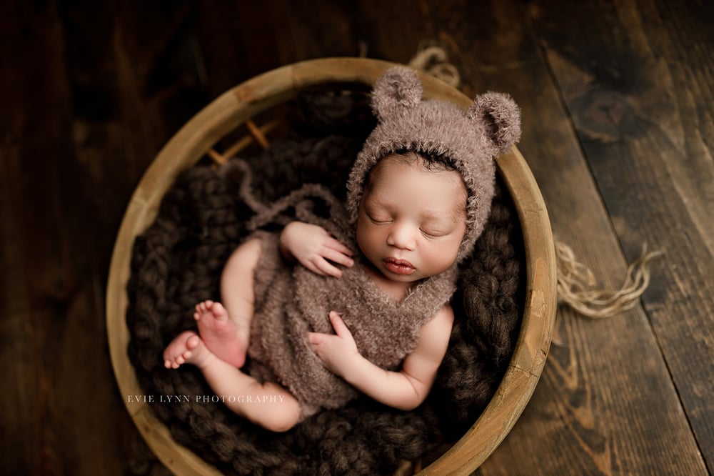 Beautiful newborn outfit with adjustable straps and front pocket. Knit from super soft and fuzzy yarn. Set includes shortie romper and bear bonnet