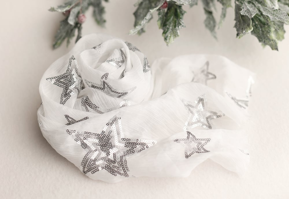 Lovely muslin layer with sequin star embroidery . Each piece measures approx 19" in width and 40" in length. No stretch.